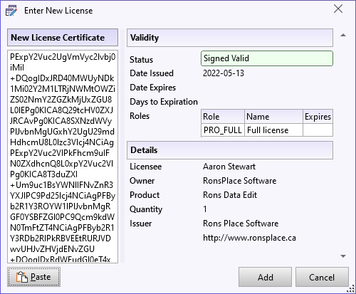 After any of these methods have been used to open the 'Add License' window (or before if preferred), copy the text from the e-mail between (but not including) the '--begin license--'and '--end license--' markers. In the 'Enter Application License' window that appears press the 'Paste' button to enter the license, if it has not been automatically entered. A Signed Valid Status confirming the validity is displayed. Click on 'Add' in order to activate it.