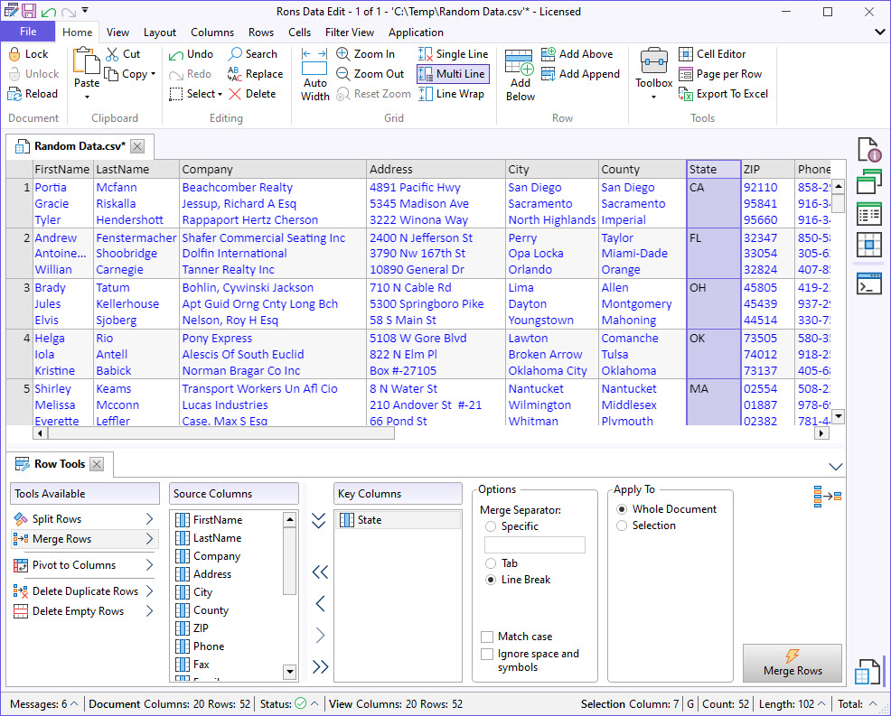 In the ribbon bar, at the top of the main window, go to the 'Rows' tab, and click on the 'Row Tools' button. This action opens the 'Row Tools' panel. From the available tools displayed, select 'Merge Rows'.