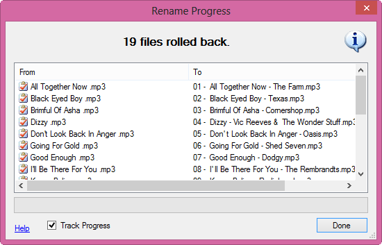 Finally, regardless of the reason for renaming to finish, if required the renaming that was done can be reversed by pressing the Roll Back button.